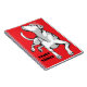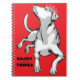 Es una libreta o cuaderno con la imagen de un perro de color blanco con el fondo de color rojo con imagen inspiradora en inglés