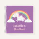 La libreta de dibujo viene con un lindo unicornio con melena y cola de color algodón de azúcar rosa. Está volando entre el arcoíris, la nube y las estrellas con sus pequeñas alas. Personaliza con el nombre del niño en la plantilla de texto proporcionada.