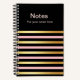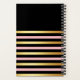 Este cuaderno es perfecto para tomar notas en cualquier ocasión. Tiene la opción de personalizar el cuaderno con tu propio nombre. Tiene un diseño de purpurina rayado con láminas doradas y rosadas sobre fondo negro.