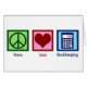 Conservación de libros de amor por la paz. Un regalo genial del contable con un tierno signo de paz, corazón y calculadora.