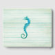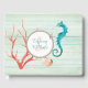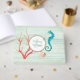 Bonito libro de bodas sobre la temática de la playa, hecho en un verde espuma de mar con un fondo de madera. Gráficos de caballo de mar turquesa, una concha de vieiras y corales decoran el área de texto enmarcada por cuerda. Personaliza los nombres de la novia y del novio, para tu boda en la playa. Hay productos que coinciden.