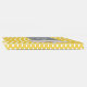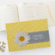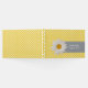 libro de bodas amarillo bonito con un pequeño patrón de puntos de polka blanco. Una cinta gris, en la parte delantera del libro, tiene texto blanco personalizado y gráficos de una margarita amarilla y blanca. Personalice los campos de texto para su día especial.