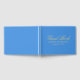El fondo azul claro y bonito del verano con un elegante texto dorado crea un hermoso libro de bodas. El libro de invitados está escrito en un guión elegante y ornamentado. Los nombres de la pareja de bodas y su fecha de boda se escriben a continuación en una simple letra de oro.