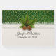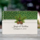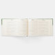 Libro de invitados temático sobre la boda de invierno realizado en un marfil antiguo con gráficos de un patrón verde y dorado en la parte superior y una cinta de encaje de marfil en el medio. Gráficos de un alfiler de pino con conos de pino, decoran el frente medio. Personalice los campos de texto para su día especial. Hay productos bodas que coinciden.