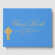 Un libro de bodas azules de verano decorado con una cruz cristiana de oro. El Libro de invitados está escrito en una gran fuente formal. Los nombres de los novios y novios y la fecha de su boda se encuentran a continuación. Puede cambiar fácilmente el color de fondo, el color del texto y el texto en sí.