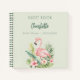 Un fondo verde salado de moda decorado con un flamenco rosa y flores tropicales y follaje. Personalice y agregue un nombre y un texto/fecha.
