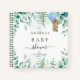 Para una ducha infantil moderna y elegante. Un fondo blanco. Decorada con vegetación eucalipto, helechos de bosque y un niño de osito de peluche con un globo azul. Personalice y agregue un nombre y una fecha. Puede utilizarse como libro de visitas o para planificar el fiesta.