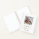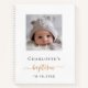 Para un bautismo elegante, neutral en cuanto a género. Un fondo blanco moda. Personalice y agregue una foto de tamaño cuadrado en la parte delantera, el nombre del niño y la fecha del bautismo. Letras negras y doradas. Atrás: agrega tus propias 3 fotos en la parte posterior, nombre y fecha de nacimiento. Imágenes de tamaño vertical (tamaño vertical)