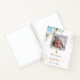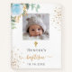 Para un bautizo elegante. Un fondo blanco chic, decorado con una rosa azul claro, vegetación de eucalipto, polvo brillo dorado falso y una cruz dorada. Personalice y agregue una foto de tamaño cuadrado en la parte delantera, el nombre del niño y la fecha del bautizo. Letras negras y doradas.