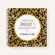 Un libro de invitados para fiesta de soltera, cuaderno en espiral con un patrón elegante. Manchas de leopardo negro exótico en un fondo dorado. Estilo salvaje y elegante. Superpuesto en la parte superior hay un marco circular blanco con un borde de lámina dorada falsa, con su texto personalizado dentro.