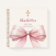 Color de fondo crema y beige. Decorada con un gran arco rosa y una cruz dorada. Personalice y agregue el nombre y la fecha.