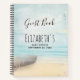 Libro de invitados en espiral de ducha para bebés con una hermosa imagen rústica. Tonos sutiles de azul claro, marrón arenoso y blanco suave. Escena de playa con un barco a orillas del mar con una red de pesca colgando de un lado. Una elegante mirada de mal gusto.