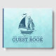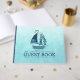 Invite a sus invitados de boda a compartir sus deseos con este diseño de libro de invitados náutico, con ilustración vintage de barco de vela con viento azul marino. Su apellido aparece debajo en elegante letra azul oscuro, con sus nombres y fecha de boda.