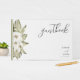 Elegante libro de bodas de orquídeas blancas en la playa.