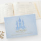 Cuento azul de hadas "Once Upon A Time" (Una vez a la vez), libro de invitado para un bebé de azul y oro, con hermosas floraciones tipográficas. El texto del guión dice "Había una vez" con un castillo mágico.