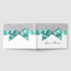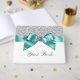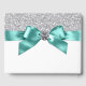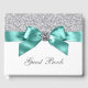 Libro de invitados azul turquesa y plata con una bonita cinta y lazo azul turquesa con centro de diamante sobre un fondo de purpurina plateada. Este elegante libro de invitados azul turquesa se personaliza fácilmente para su evento simplemente agregando el texto de su elección en el estilo de fuente que prefiera. Este es un diseño impreso sin purpurina real, diamantes, cintas, lazos, etc.