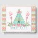 Libros de invitados de fiesta de cumpleaños tribal con teepee floral rosa y azul teal y globos en un diseño de fondo de indio americano nativo rosa, menta y dorado. Este lindo libro de invitados de fiesta de cumpleaños teepee se personaliza fácilmente para su evento simplemente agregando sus detalles en el estilo de fuente de su elección. Este lindo diseño de libro de invitados tribal funciona bien para una fiesta de cumpleaños y un libro de invitados de baby shower.