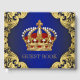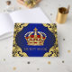 Libro de invitados del príncipe con hermosa corona real roja y dorada sobre un fondo azul real y dorado con remolinos. Este libro de invitados con tema de príncipe y rey de azul real y dorado se personaliza fácilmente para su evento simplemente agregando el texto que desee.