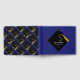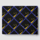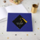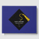 Libro de invitado creativo para graduaciones que incluye palabras de consejo y buenos deseos de suerte con patrón de gorras negro y oro sobre fondo azul. Para personalizar el texto de edición para añadir el nombre del graduado, el año escolar y el año de clase superior.