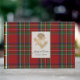 El libro de boda Highland se inspira en el clásico diseño de lona de color rojo, verde, azul, amarillo, negro y blanco de Royal Stewart. Un área de texto con marcos dorados, en la parte delantera del libro, tiene gráficos de un guiño dorado y texto personalizado negro listo para personalizar.