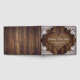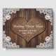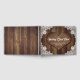 Elegante libro de boda rústico inspirado en un corazón de burún sobre un fondo de madera rodeado de encaje floral blanco. La elección perfecta para una romántica fiesta de bodas rústica.