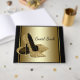 Libro de invitados de zapato de tacón alto negro y dorado de mujer con un par de zapatos de tacón alto de purpurina dorada sobre un elegante fondo negro y dorado. Puede personalizar fácilmente este hermoso libro de invitados de cumpleaños de mujer negro y dorado para su evento simplemente agregando su texto en el estilo de fuente de su elección. Este es un diseño impreso sin purpurina real.