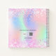 Un libro de invitados para una fiesta de cumpleaños 18 (o de cualquier edad). Un fondo holográfico de moda en tonos rosa, violeta y verde menta. Decorado con confeti de color rosa. Personalice y añada un nombre, el nombre está escrito con letras de color púrpura de estilo moderno con letras a mano.