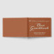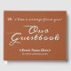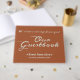 Este libro de visitas conservador incluye los mensajes "Nuestro libro de visitas" y "¡Nos encantaría un mensaje de ustedes!", junto con un nombre personalizado de fecha y evento/ocasión. El texto es cian claro de color y el fondo es siena de color. Un libro de personalizable genérico como este podría ser usado en un evento como una reunión familiar, una fiesta de cumpleaños, una ducha de bebé o algún otro evento.