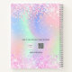 Un libro de invitados para una fiesta de cumpleaños de Quinceañera. Un fondo holográfico de moda en tonos rosa, violeta y verde menta. Decorado con confeti de color rosa. Personalice y añada un nombre, el nombre está escrito con letras de color púrpura de estilo moderno con letras a mano.
