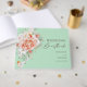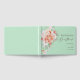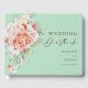 Este libro de bodas florales y femeninas, de bonito, cuenta con melocotón y flores blancas con vegetación y elementos de oro rosa sobre un fondo verde menta. Esto sería perfecto para un boda al aire libre clásico y romántico. Personalice la portada con los nombres de la novia y del novio.