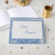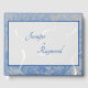 El diseño presenta un elegante efecto "marbling" de tonos azules y grises como fondo de la forma que muestra los nombres de novia y novio. En el reverso aparece el mismo efecto de mareo con la imagen de la cinta y el arroz tirado. El texto del personalizable en la columna vertebral dice: "Nuestro Boda". Diseñada para acompañar la "Suite Boda de Mármol Azul y Gris".