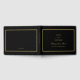 Elegante libro de boda negro y dorado con nombres de novios y novios, título del libro, fecha boda y ubicación dentro de un delgado borde dorado. Negro espinoso con nombres de novias y novios dorados con título de libro. Negro negro de espalda con novia de oro y novio nombran un centro inferior, borde de oro. Texto elegante en bloques y guiones.