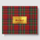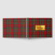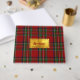 Colorido libro de oro hecho en el clásico rojo, verde, azul, amarillo, negro y blanco del trenzado de Royal Stewart. Un área de texto de tono dorado, en la parte delantera del libro, tiene texto personalizado rojo listo para personalizar.
