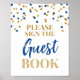 Por favor firme nuestro cartel de señal de libro de invitados de boda en azul marino oscuro y patrón de confeti dorado con letras de estilo escrito a mano. Perfecto para bodas, baby showers, fiestas de novia, aniversarios, cumpleaños y más.