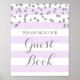 Por favor, firme nuestro cartel de libro de invitados para baby shower, despedida de soltera o boda en patrón de rayas lavanda claro y blanco con confeti plateado, por favor tenga en cuenta que plateado es solo efecto fotográfico. Perfecto para una baby shower, boda o despedida de soltera.