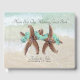 Plantilla de libro de bodas de dos novias de estrellas. Dos estrellas marrones del mar comparten una franja floral verde y parecen "tomarse de la mano" en la portada de este libro de eventos de temática playera. Personalizar fácilmente tres líneas de texto para el título, los nombres y la fecha del evento. El entorno es bastante agradable, con arena y olas, y lo mismo ocurre en la parte trasera.