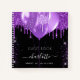 Un elegante fondo negro con purpurinas falsos morados gotea y polvo. Decorada con globos morados. Personalice y agregue un nombre, edad y fecha. El nombre está escrito con un guión moderno de estilo con letras a mano con toques. Para que los cambios sólo eliminen el nombre del ejemplo, deje los espacios o la emoji delante y después del nombre. Se puede usar como un libro de fiestas, para planear al fiesta o como favores partidarios.