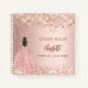Un libro de visitas para una fiesta femenina y glamorosa de dulces 16, 16 años. Un elegante fondo dorado rosa con confeti y un chica vestido de princesa, bata de bolas. Personalice y agregue su nombre, edad/fecha. El nombre se escribe con un guión de estilo con letras a mano.