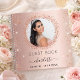Un libro de invitados para una fiesta femenina y glamorosa de dulces 16, 16 años. Un oro rosa de diseño, fondo de color negro con un marco de fotos de oro subió. Añade tu nombre, edad, fecha y una foto. Atrás: un gran arco rosado.