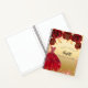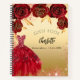 Para una Quinceañera, fiesta de cumpleaños número 15. Un fondo de oro falso con polvo falso purpurina, un vestido y rosas rojas, flores. El nombre está escrito con una escritura de estilo con letras a mano moderna. Personalice y agregue un nombre y una fecha.