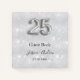 Un falso fondo metálico plateado, decorado con un polvo falso purpurina. Personalice y agregue un título, sus nombres y una fecha. El número 25 está escrito en plata falsa con un tipo de letra de estilo globo.