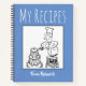 Un cuaderno para grabar recetas favoritas, consejos y trucos de cocina. Agregue el nombre del propietario y del compilador para hacer de esto un elemento verdaderamente personal que será valorado durante mucho tiempo. Ilustracion de una mujer con el gorra del chef, una pasarela, con un pastel y una temática de color azul y blanco. Regalo para un cocinero, o un buen regalo para un ventilador.