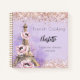 Un cuaderno de recetas de temática francesa y parisina. Un fondo violeta con un confeti de oro rosa y la Torre Eiffel, París con flores. Añadir un nombre, texto.