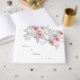 Este elegante libro de firmas de boda gris rosado blanco presenta rosas 3D en un fondo blanco, nombre de novia y novio en una fuente moderna elegante y escritura a mano.
