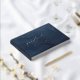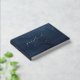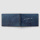 Un elegante y sofisticado libro de bodas color azul marino polvoriento y plateado con caligrafía de batido de Relieve metalizado plateado con sus nombres en una moderna fuente san serif en el frente, columna vertebral y cubierta trasera.