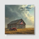 A rustic wooden barn with an American flag and a vintage red tractor is set against a dramatic sky filled with towering storm clouds