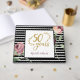 Elegante y chic libro de firmas para el 50 aniversario de boda con rosas rojas acuarela sobre fondo de rayas en blanco y negro. Diseño de texto elegante en dorado y brillo falso.