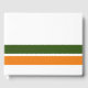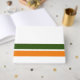 Este diseño deportivo y formal presenta audaces rayas de carreras de borde inferior de color verde y naranja cálido contra un fondo blanco crujiente.