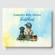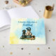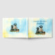 Libro de visitas personalizado para la ducha de bebé. Ducha de bebé con temas de béisbol azul y amarillo. Niño vintage sentado al lado de un perro, un laboratorio negro con gorra de béisbol, murciélago y guante. Fondo azul y amarillo.