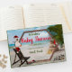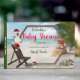 Vacaciones veraniegas en la playa durante los Navidades con pingüinos bailarines bajo las palmeras para personalizar para una niña o niño ( Gracias dice la cigüeña al fondo )